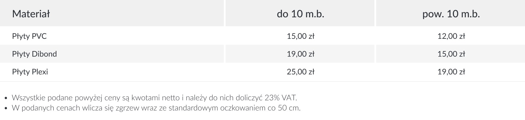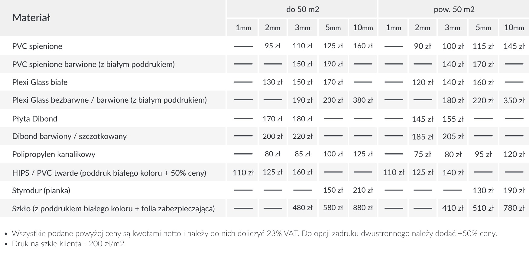 Ponadto wykonujemy tablice na płytach z następujących materiałów – STYRODUR, PET, HIPS, MDF. Zachęcamy do zapoznania się z ofertą druku tablic i szyldów w technologii ecosolwent oraz UV zaprezentowaną w poniższej tabeli.