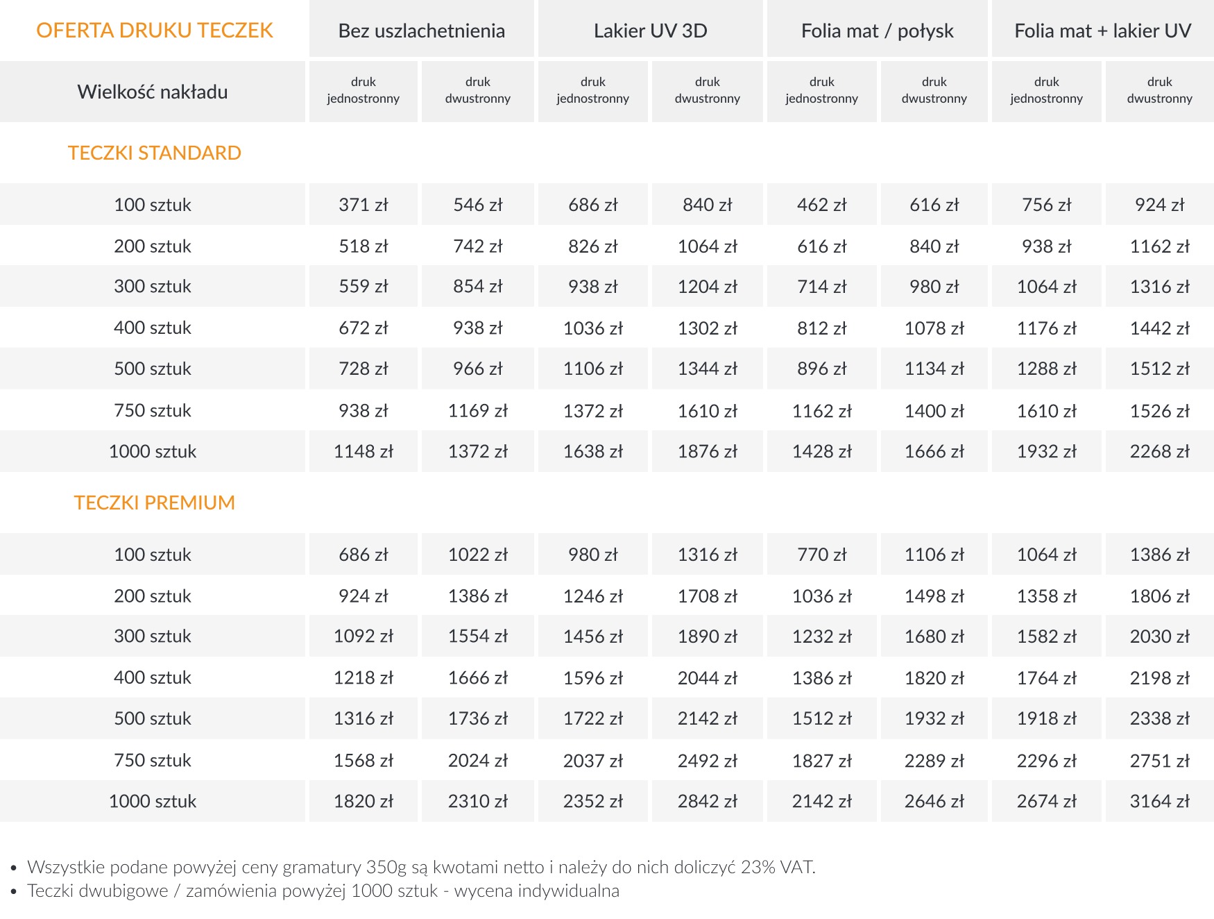 Każdy model teczek możemy dodatkowo uszlachetnić, stosując matowe lub połyskliwe foliowanie oraz wybiórczy lakier UV, który uwypukli wybrane elementy projektu, dodając im wyjątkowego charakteru i wyróżniając na tle konkurencji. Takie wykończenie nie tylko zwiększa estetykę teczek, ale również ich trwałość.