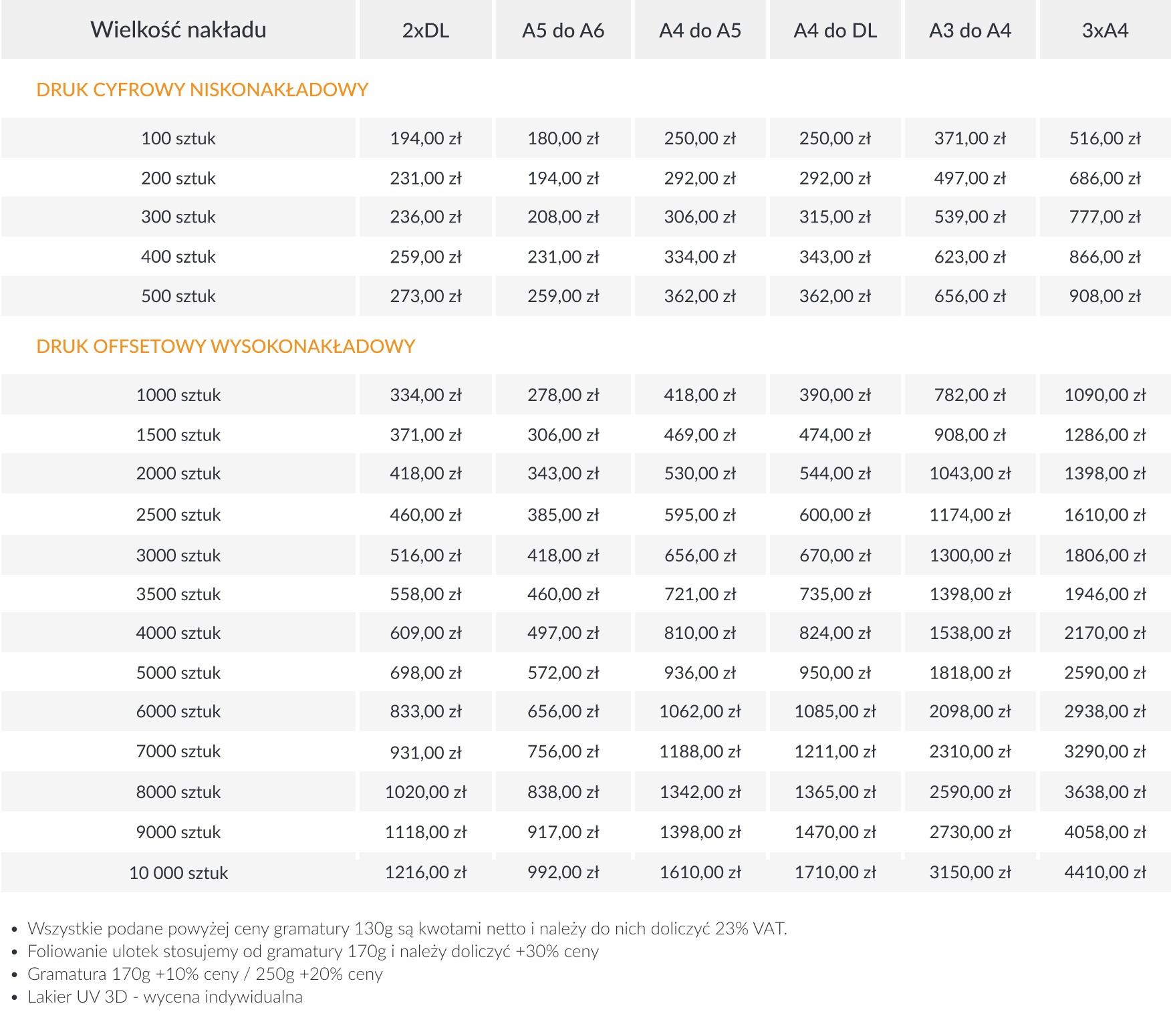 Zapraszamy do skorzystania z naszej bogatej oferty ulotek składanych, które realizujemy już od minimalnego zamówienia 100 sztuk. Każde zamówienie poprzedzamy prezentacją gotowego projektu ulotki , zapewniając satysfakcję i dopasowanie do Twoich potrzeb. Skontaktuj się z nami, aby omówić szczegóły naszej współpracy i odkryć, jak ulotki składane mogą pozytywnie wpłynąć na rozwój Twojego biznesu.