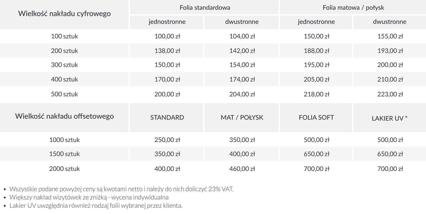 Nasze doświadczenie i zaangażowanie w tworzenie wysokiej jakości wizytówek są gwarancją zadowolenia każdego klienta. Zapraszamy do współpracy wszystkich, którzy pragną, aby ich marka była zapamiętana przez potencjalnych przyszłych kontrahentów. Nasze biuro chętnie odpowie na wszelkie pytania, udzieli niezbędnych informacji i pomoże dostosować ofertę do indywidualnych potrzeb Twojego biznesu.